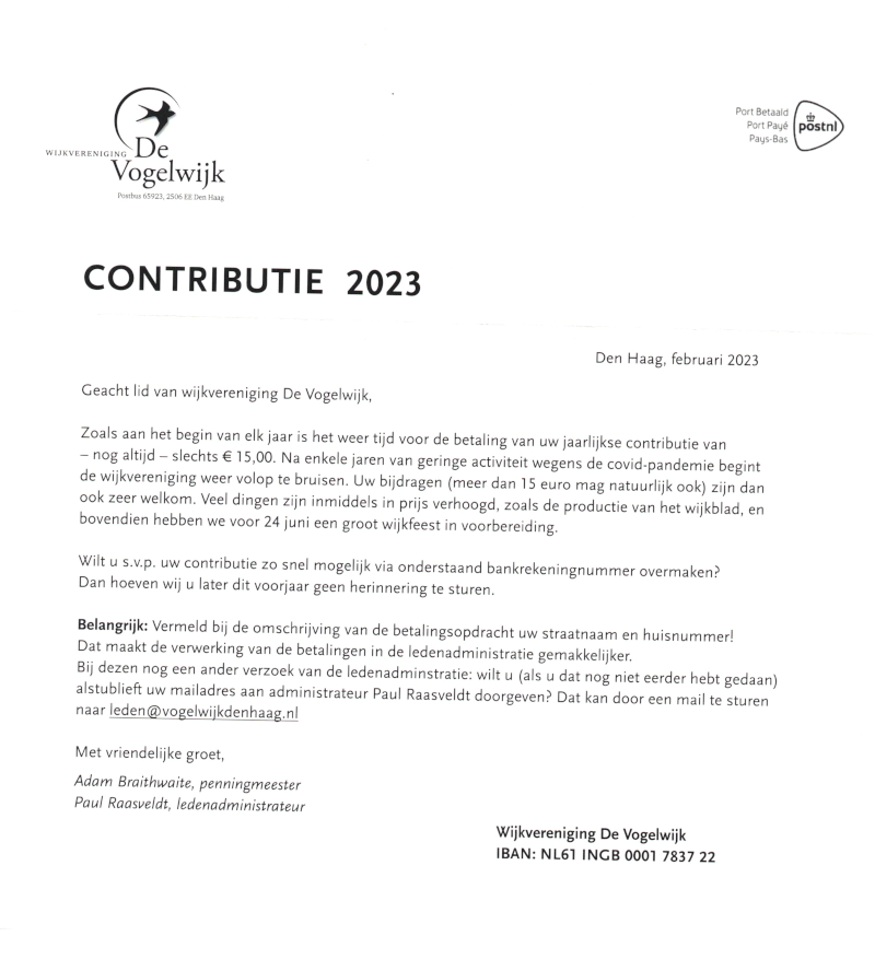 Contributie 2023 Vergeet niet uw jaarlijkse contributie voor het jaar 2023 aan de wijkvereniging zo spoedig mogelijk over te maken!Zie de factuur die bij de januari/februari editie van het wijkblad is meegezonden. 0 Facebook Twitter Google + Pinterest Geef een reactie Annuleer Save my name, email, and website in this browser for the next time I comment. Δ